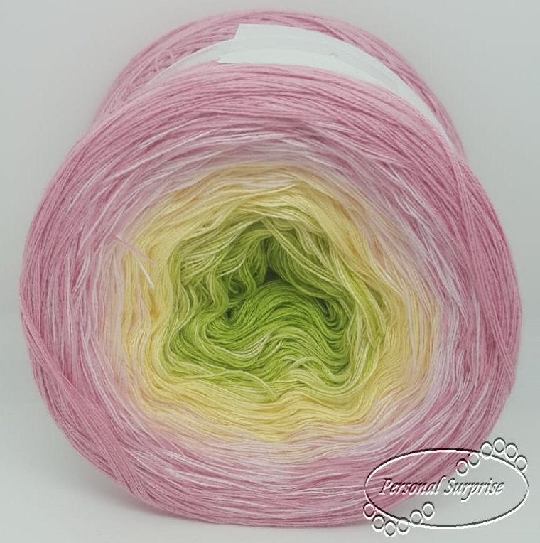 Die Fäden sind gefacht nebeneinanderliegend, nicht miteinander verdreht. Dadurch entstehen an den Farbwechselstellen kleine Knötchen, an denen einzelne Fäden abstehen. Diese sind ein charakteristisches Merkmal des Sarmingo Bobbels und können problemlos mitverarbeitet werden, ohne dass sie im fertigen Werk auffallen.